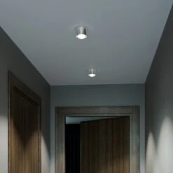 Das Besondere an der Deckenleuchte PUK SIDES ist, dass sie auf jeweils einer Seite der Schirme mit einer Linse aus Glas bestückt ist, die das Licht bündelt und auf effektvolle Weise an den Raum abgibt. Auf der anderen Seite ist eine Scheibe aus weiß mattiertem Glas angebracht.