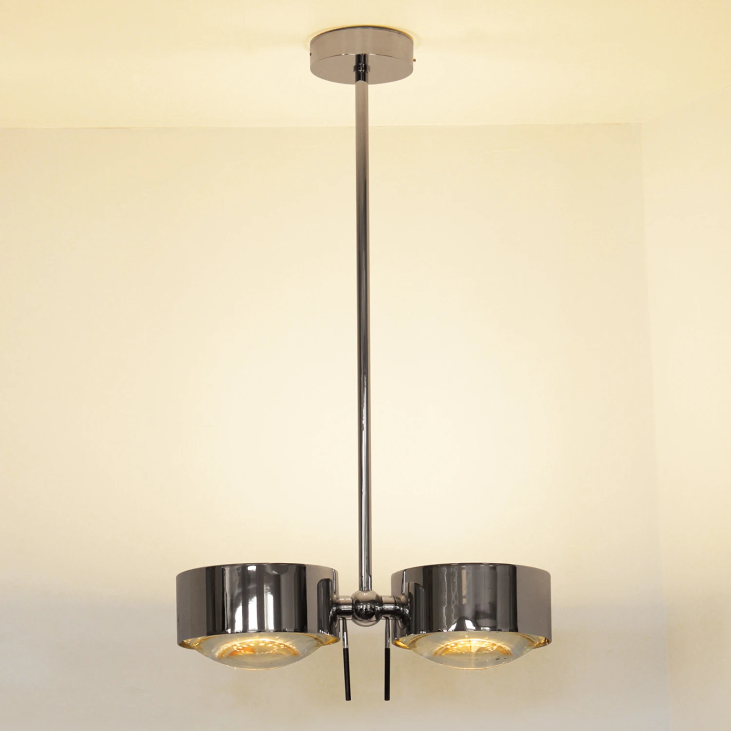 Das Besondere an der Deckenleuchte PUK SIDES ist, dass sie auf jeweils einer Seite der Schirme mit einer Linse aus Glas bestückt ist, die das Licht bündelt und auf effektvolle Weise an den Raum abgibt. Auf der anderen Seite ist eine Scheibe aus weiß mattiertem Glas angebracht.